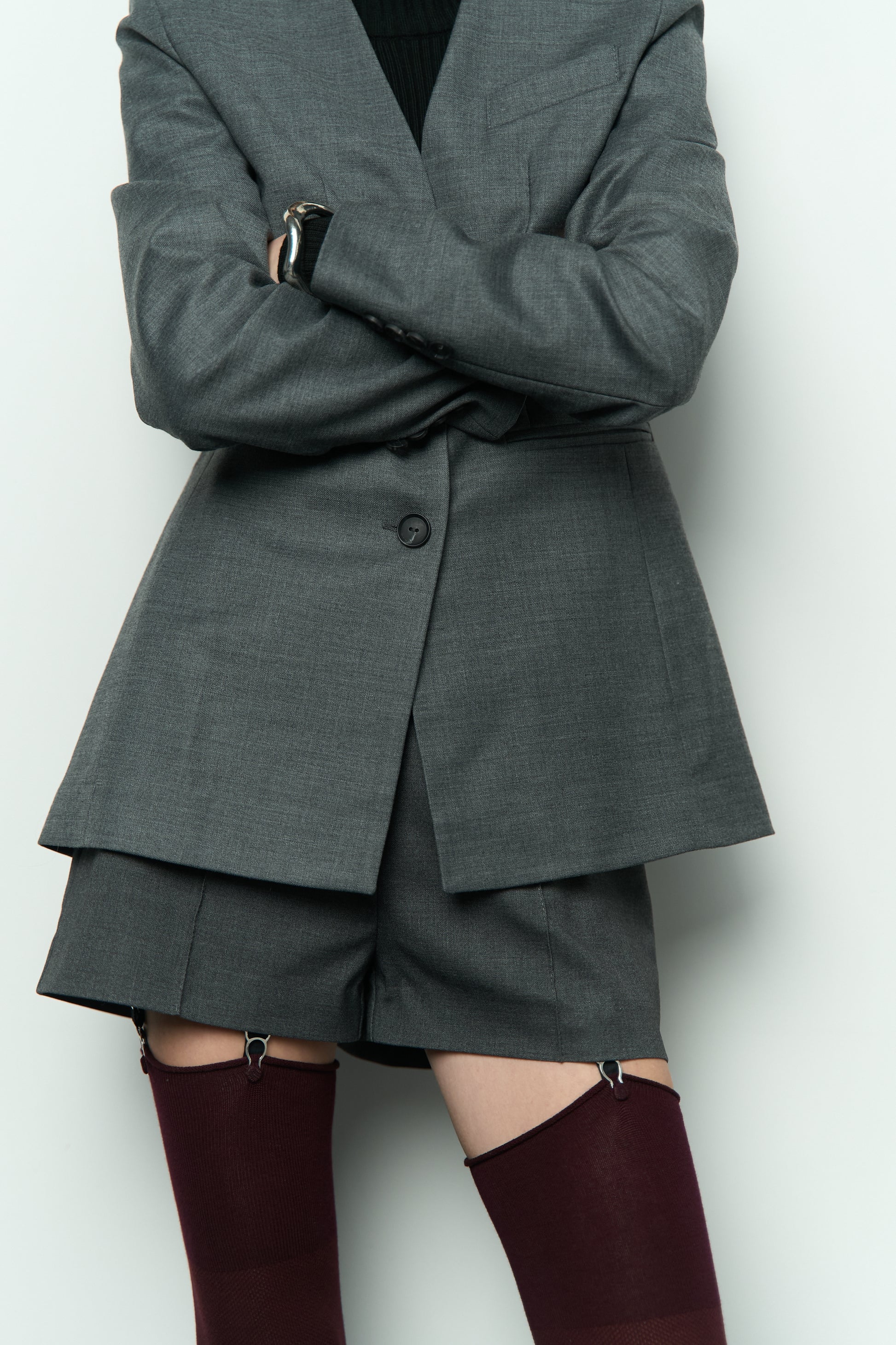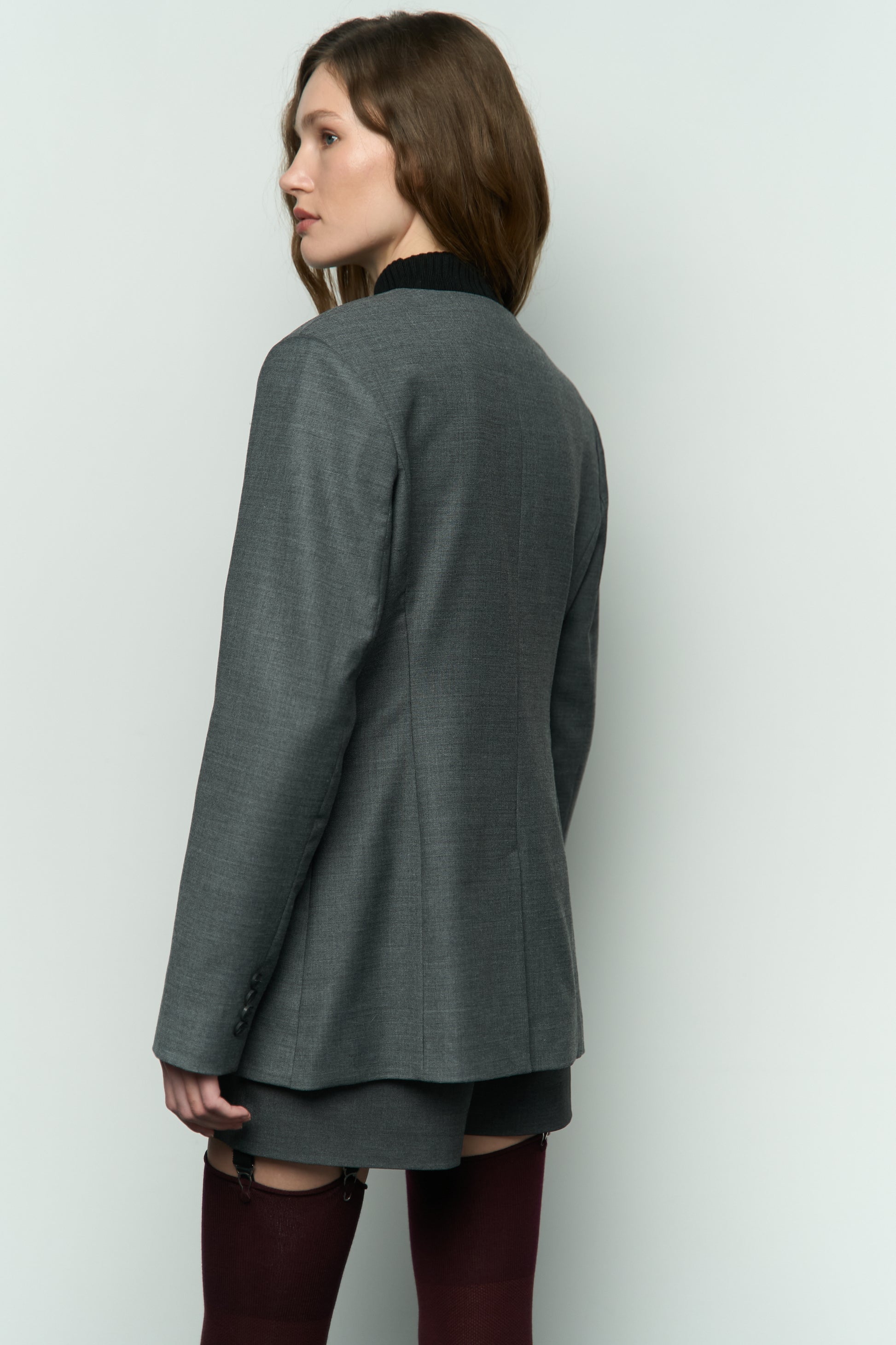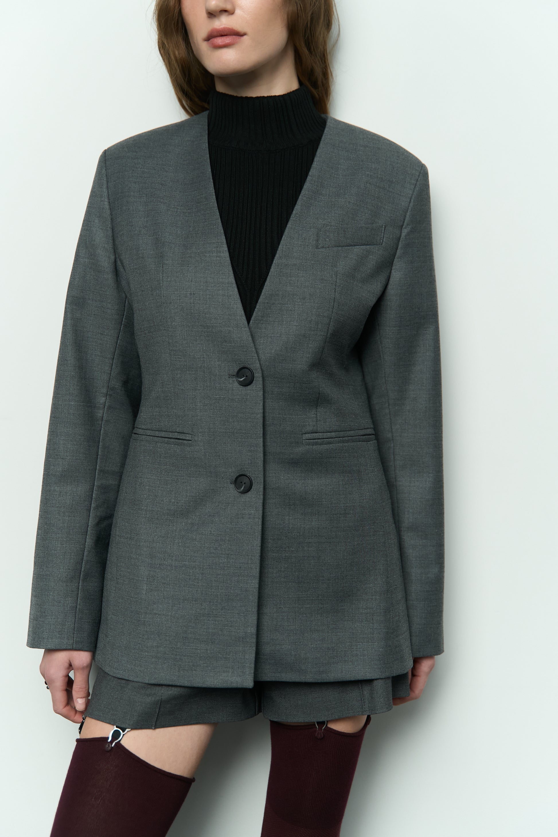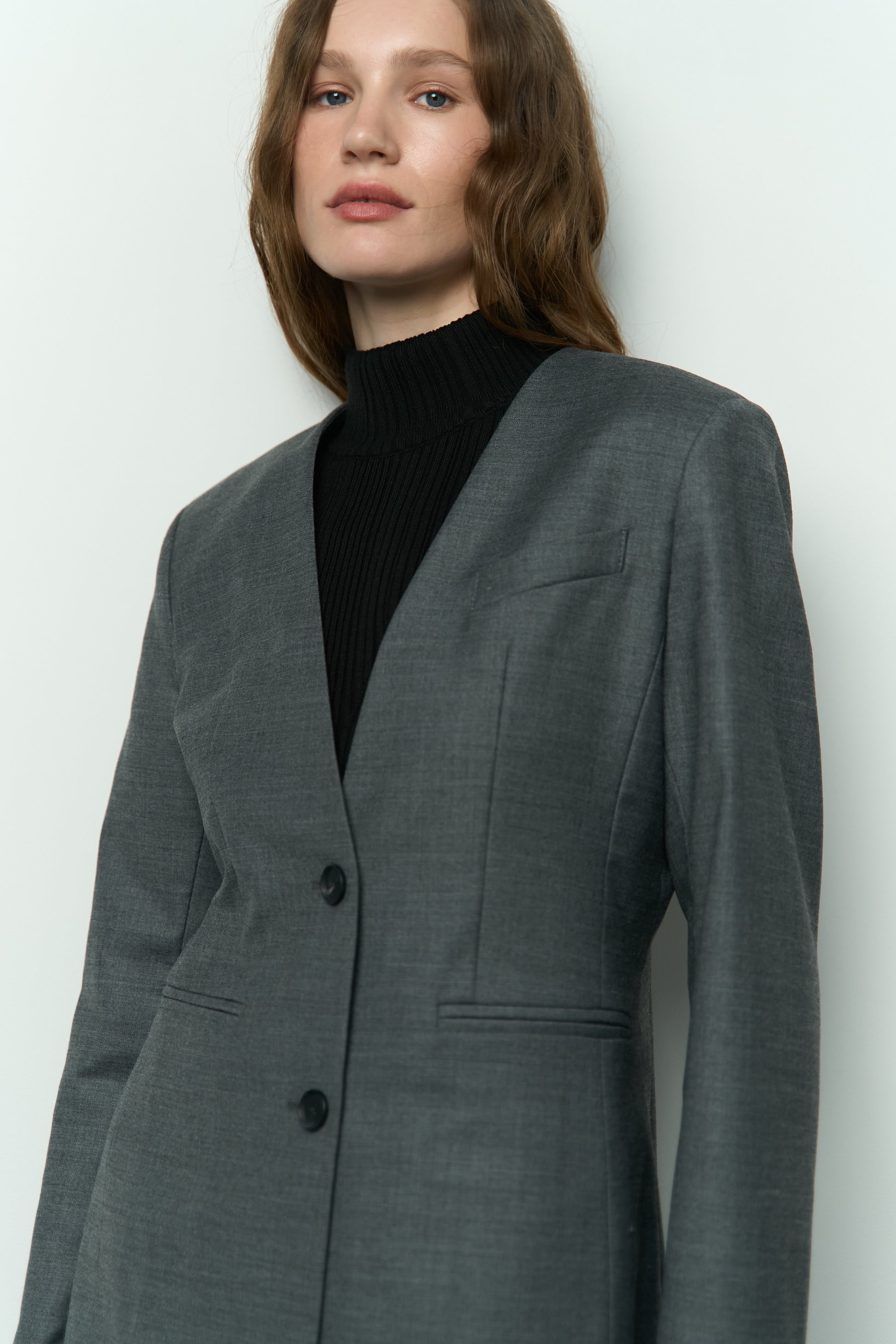 Силуетна модель жакету втілює спокійну естетику чистих ліній та форм. Класичний крій довершений мінімалістичним трикутним вирізом без коміра.
