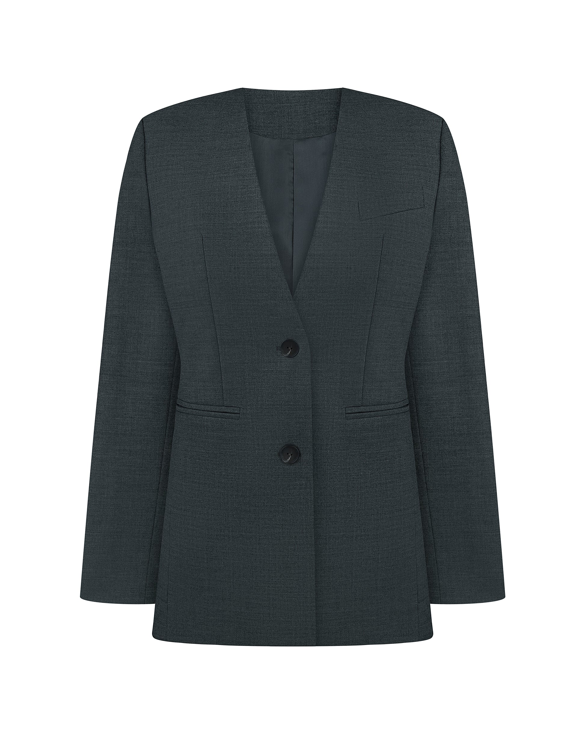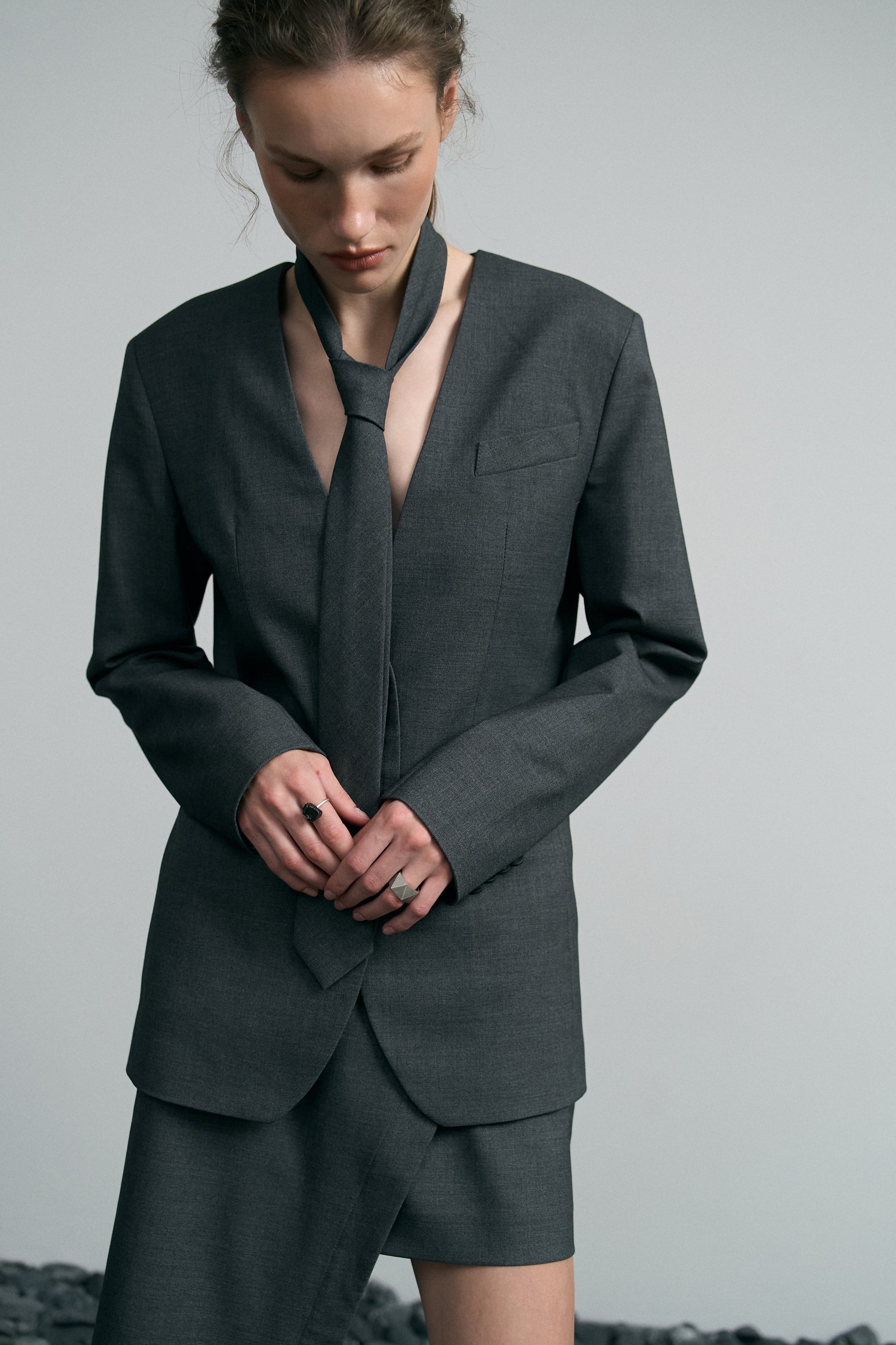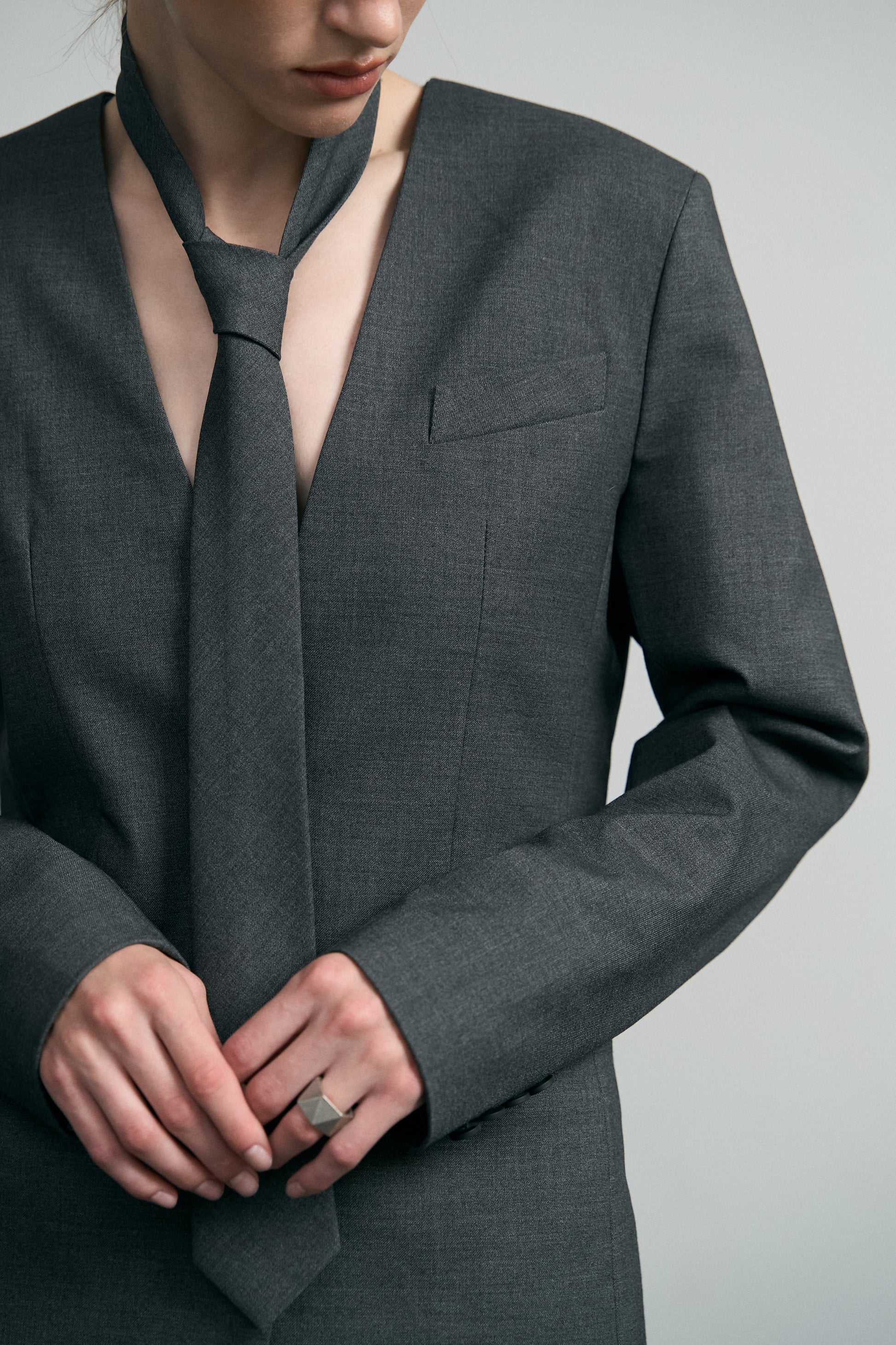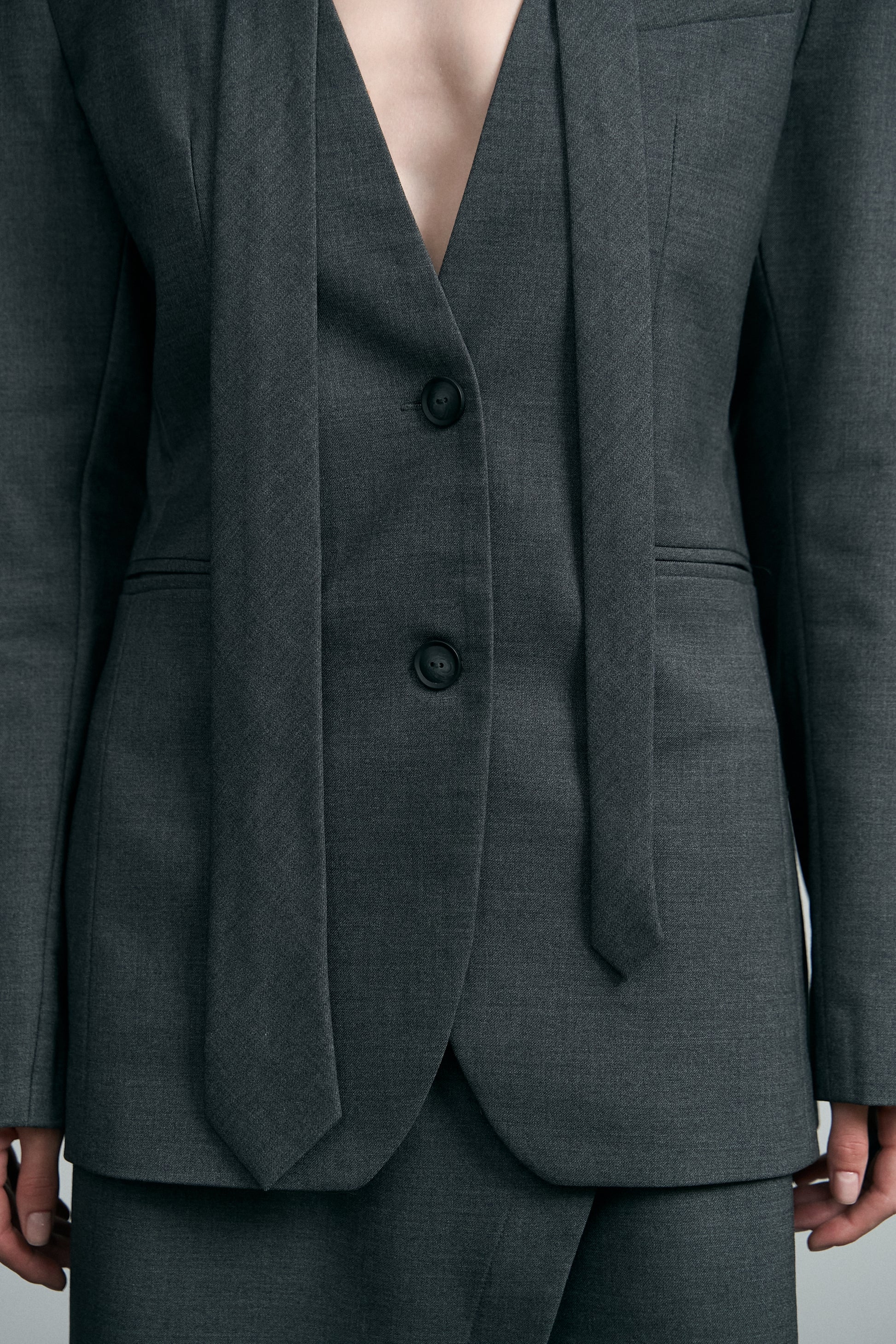 Силуетний жакет з краваткою STATEMENT втілює спокійну естетику чистих ліній та форм. Класичний крій довершений мінімалістичним трикутним вирізом без коміра та краваткою, яку можна носити у звичний спосіб, як пояс на талії та в якості шалика без вузла.