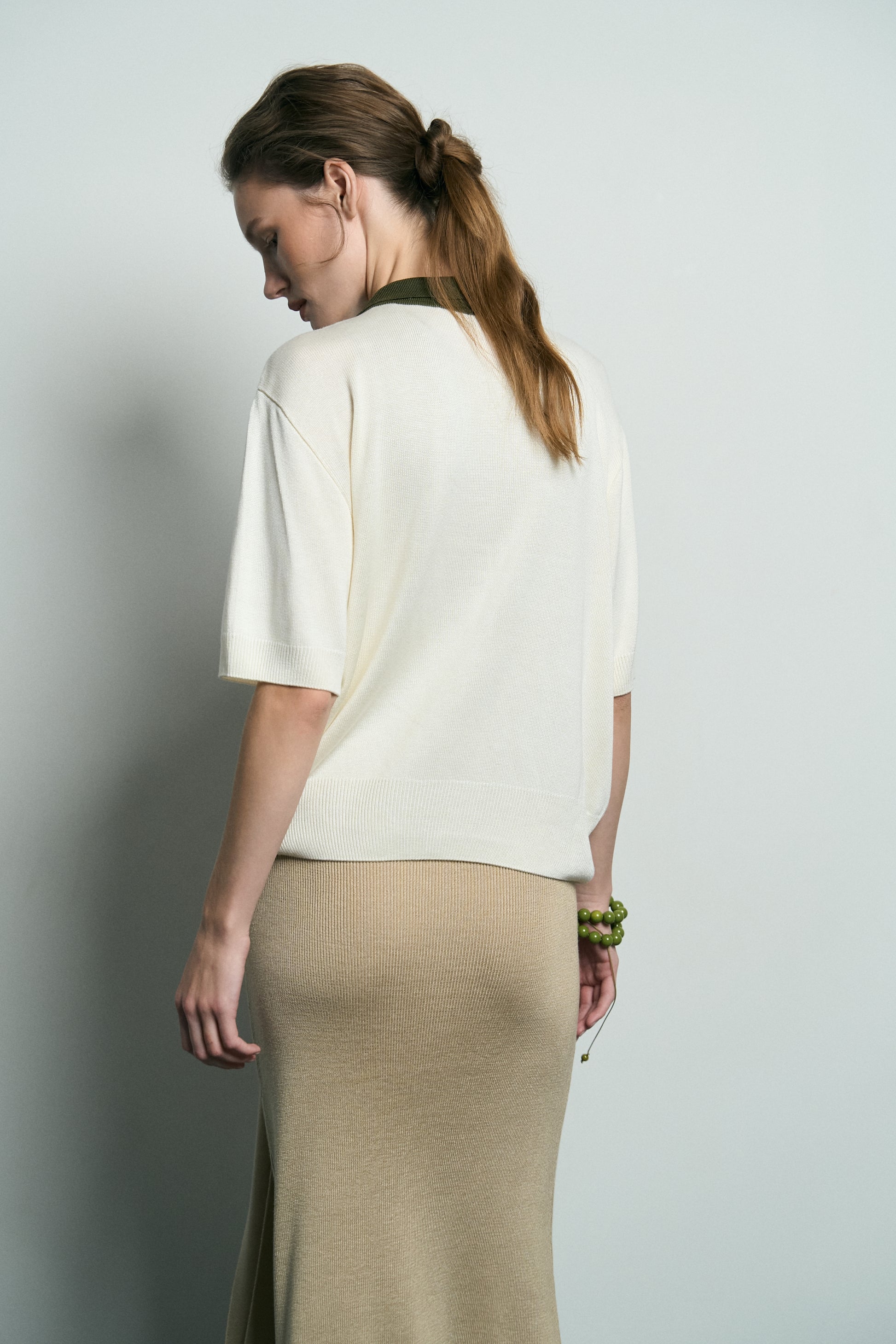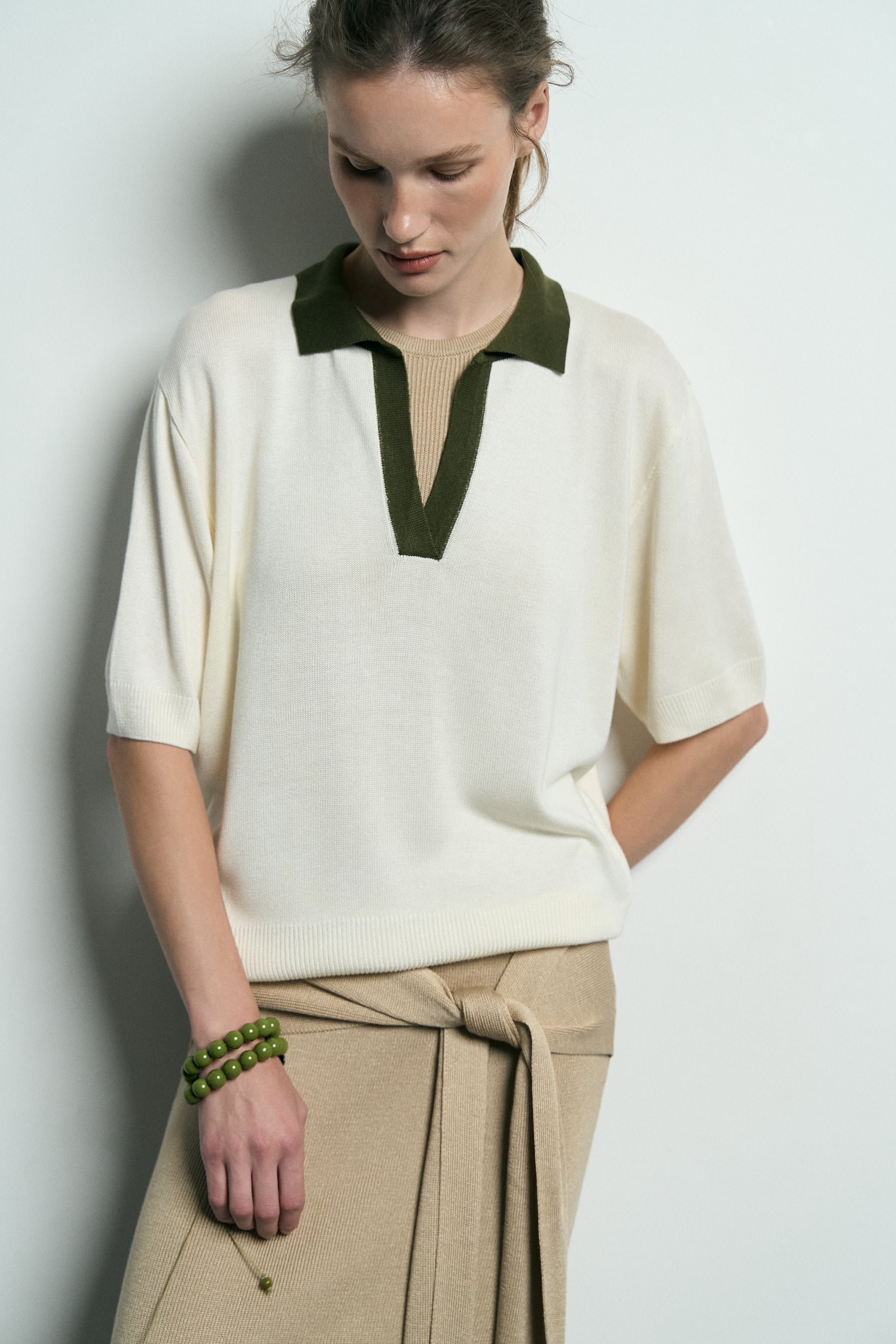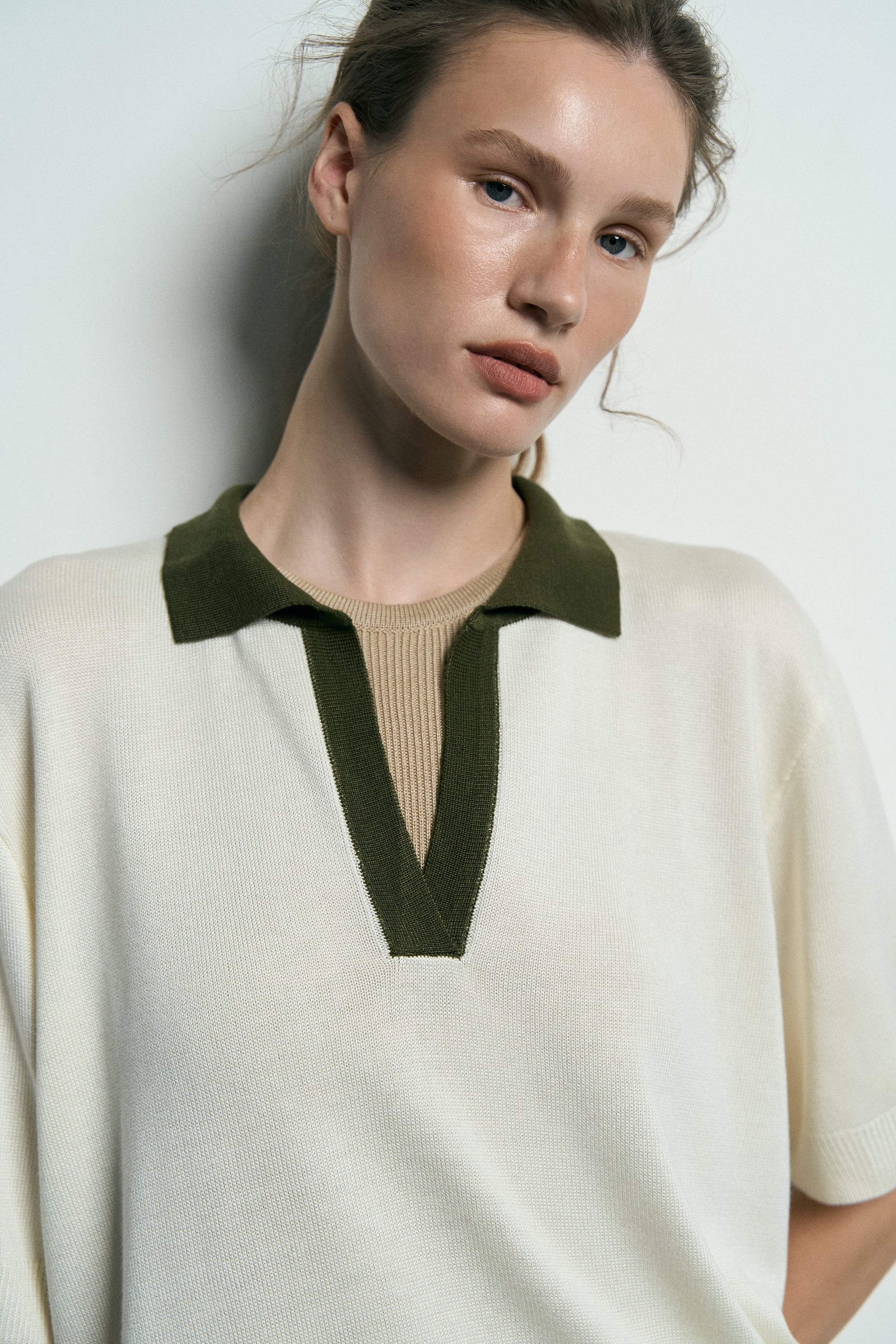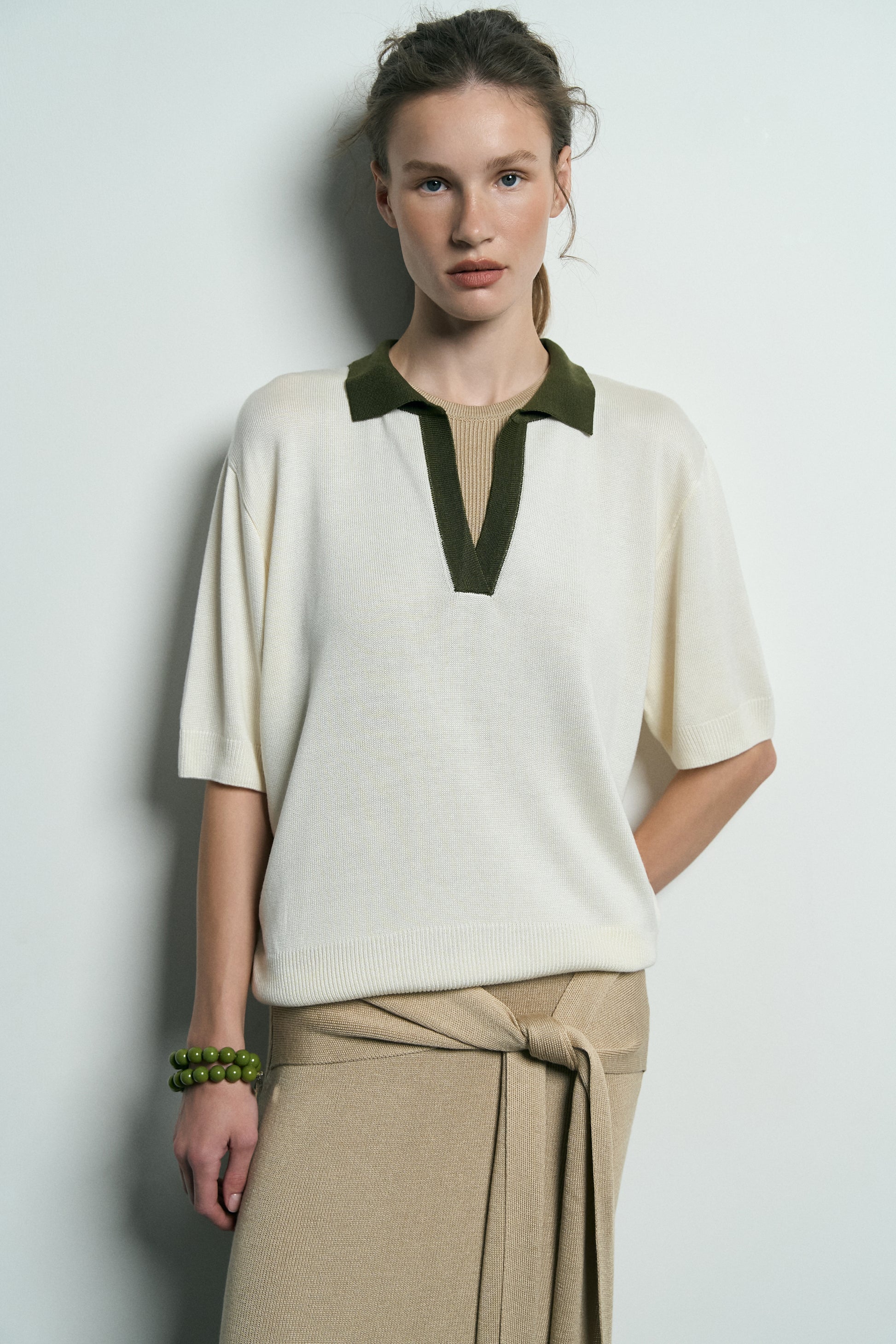 Поло виготовлене з преміальної віскозної пряжі, яка вирізняється мʼякістю та довговічністю. Модель виконана в техніці лицьової вʼязки. Має класичний комір та еластичні манжети.