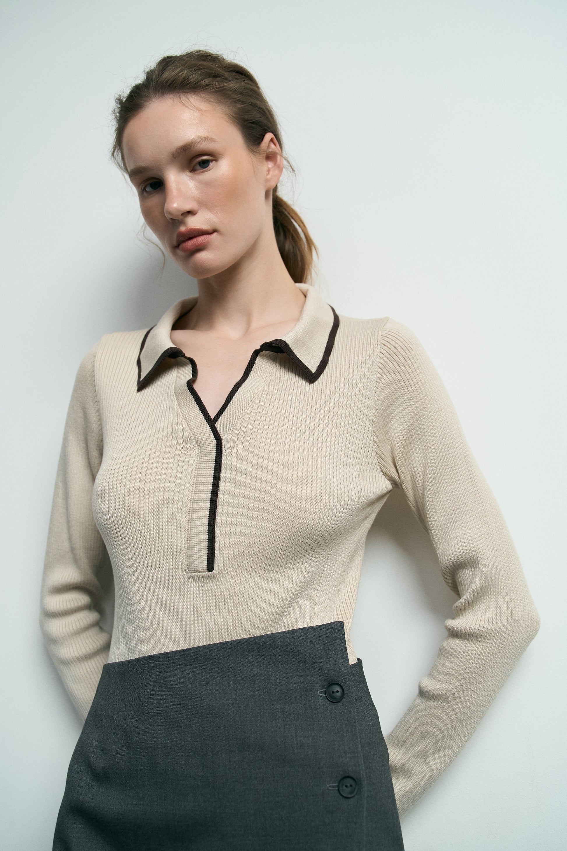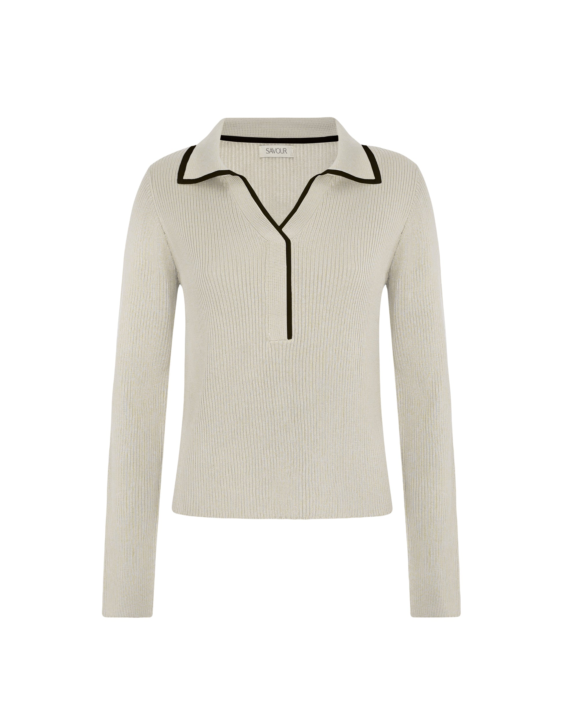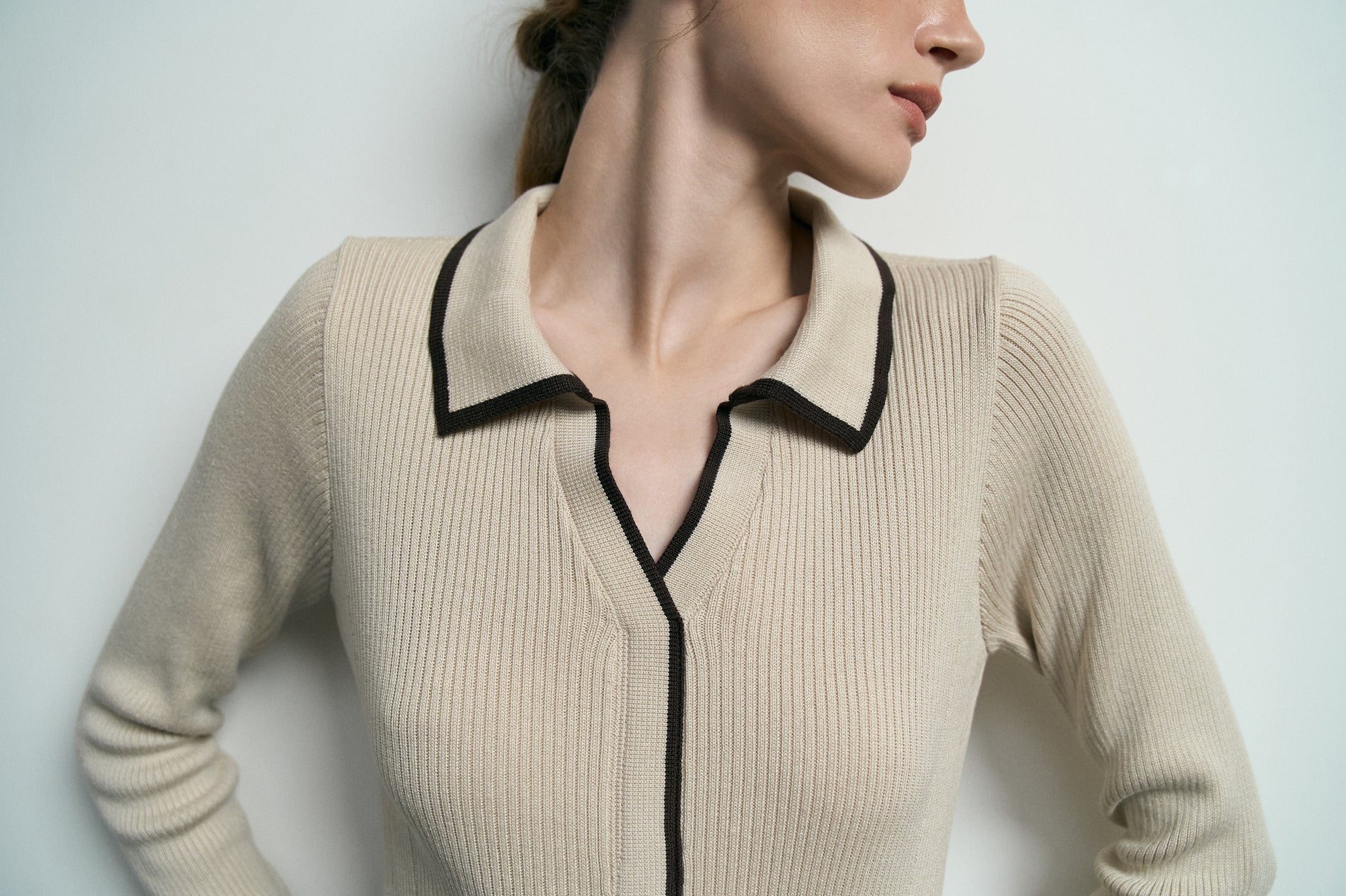 Поло з довгим рукавом та відкладним коміром. Основне полотно виробу виконане вʼязкою з дрібним повторюваним патерном. Поло прикрашене контрастними смугами на