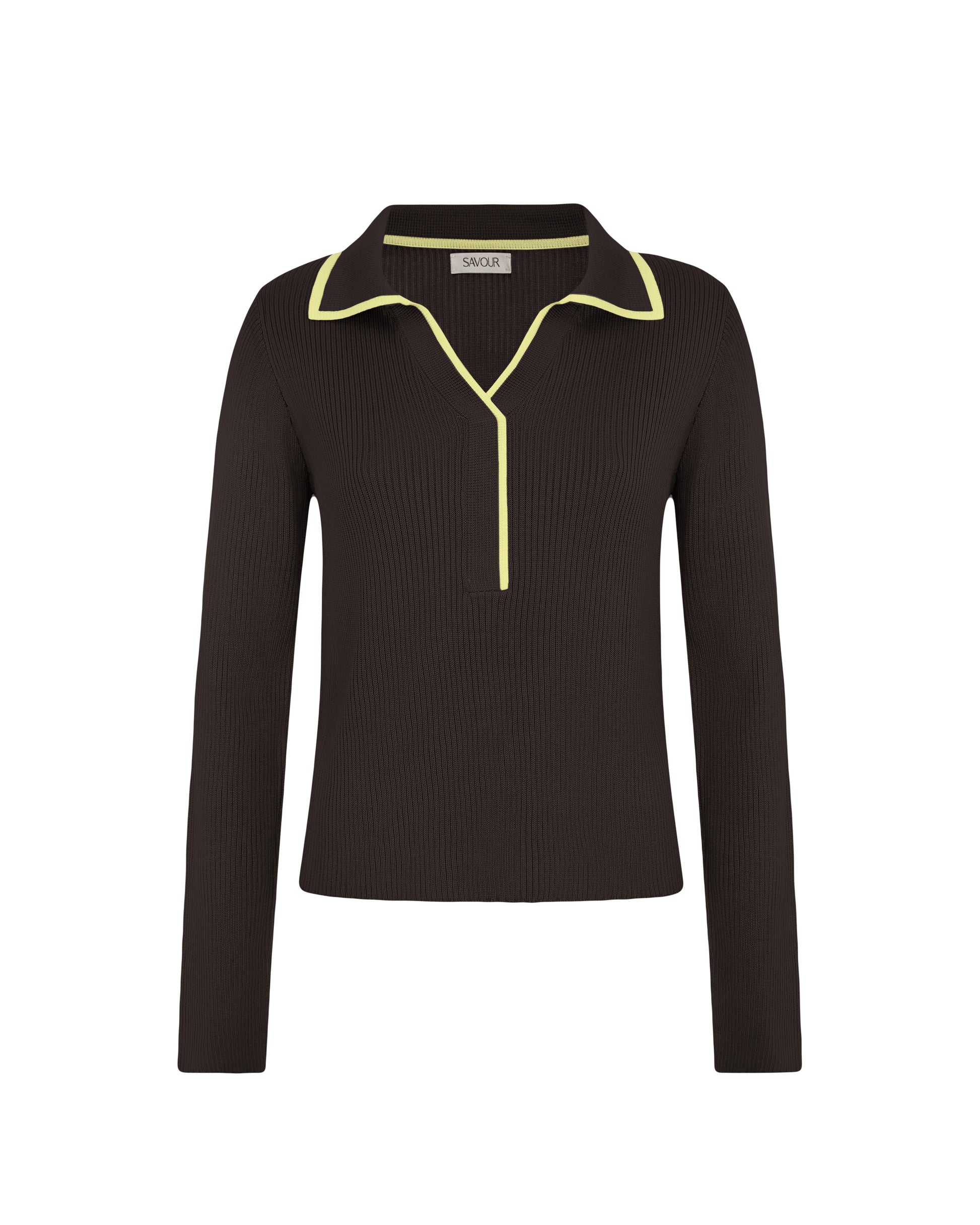 Поло з довгим рукавом та відкладним коміром. Основне полотно виробу виконане вʼязкою з дрібним повторюваним патерном. Поло прикрашене контрастними смугами на